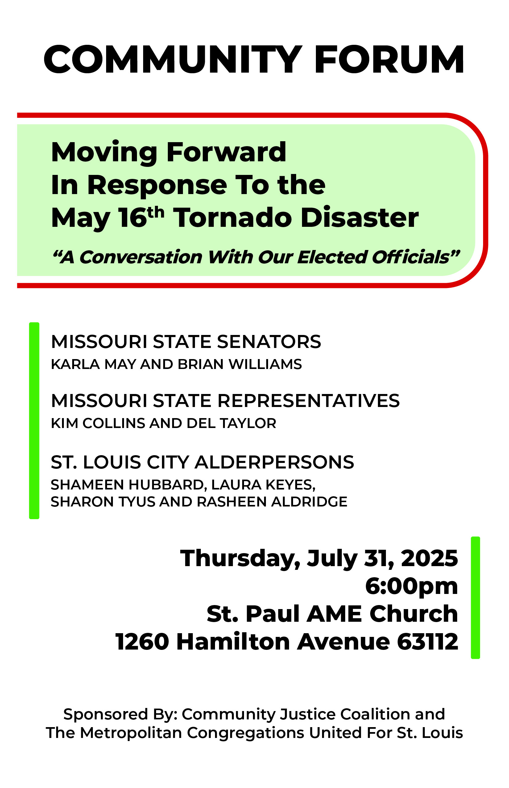 Moving Forward in response to the May 16th Tornado Disaster – A conversation with our elected officials – July 31, 2025