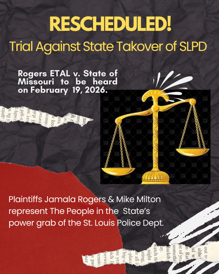 Rogers ETAL V. State of Missouri to be heard on February 19, 2026. Plaintiffs Jamala Rogers & Mike Milton represent The People in the State’s power grab of the St. Louis Police Dept.